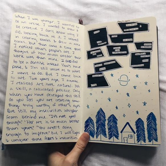 There’s no such thing as being “good” at art; it’s not a natural talent you are born with. But you don’t have to call yourself an artist to create journals. It opens up the world of art on a simple, minimal level, allowing you to be creative without the intimidation and expectations some assume go along with making art. Art can be difficult sometimes, but it also can be freeing.