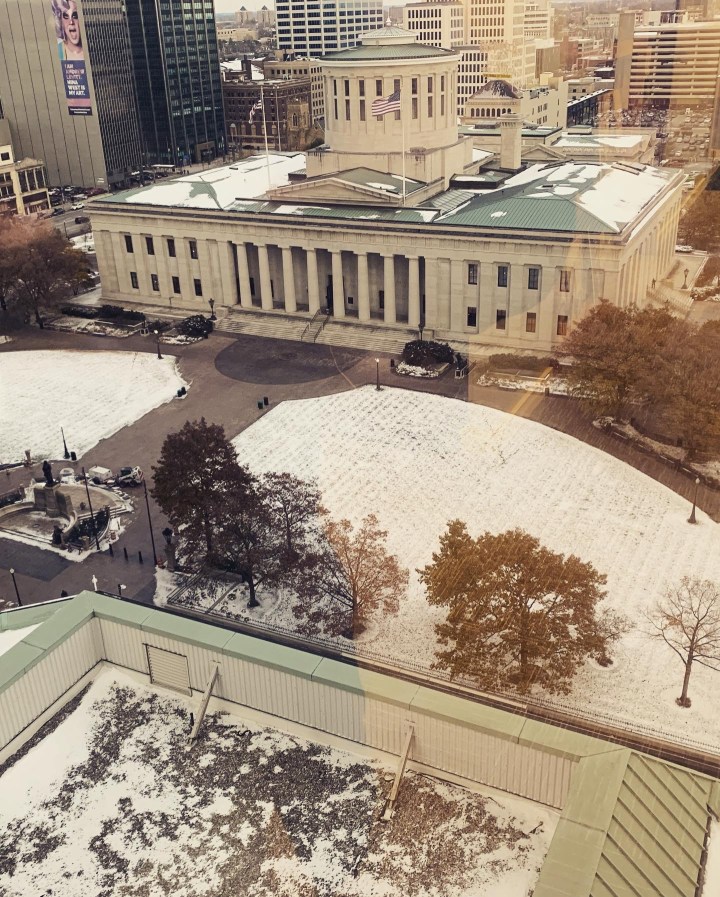 After getting off the highway with fifteen minutes to spare, the next issue was parking. By the House of Representatives office building, all the street parking was taken. The parking garage in the building next door: taken. Many minutes later, we found a spot; however, it was quite a large distance away from the office building I needed to be at. And so my mom and I exited the car and paid the parking meter and entered the cold tundra that is the streets of downtown Columbus. Narrow streets marked by skyscrapers created a wind tunnel that decreased the temperature into what seemed like negatives. We trudged as quickly as we could to the office building, passing the statehouse on our way there.