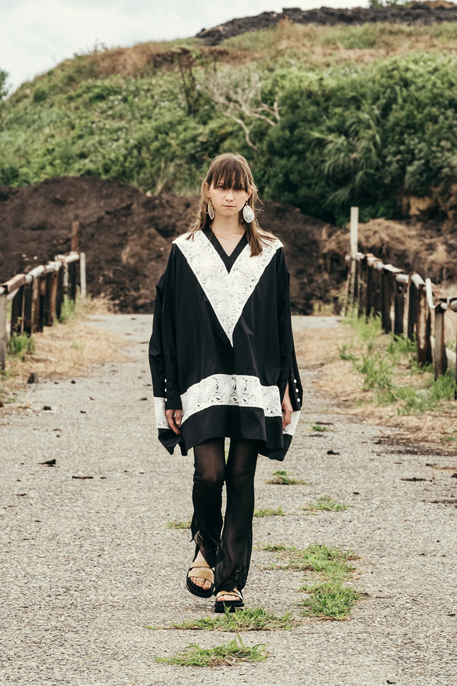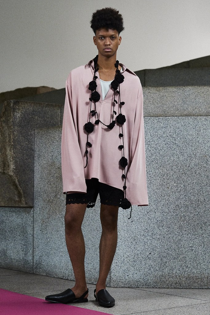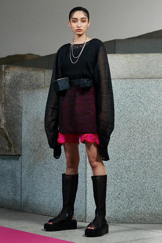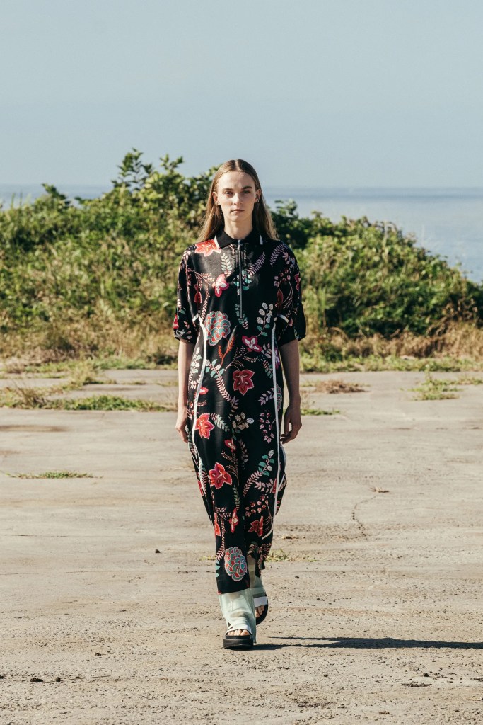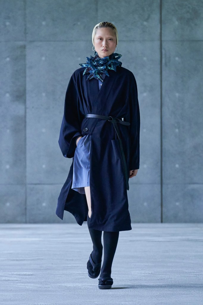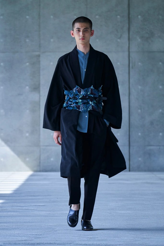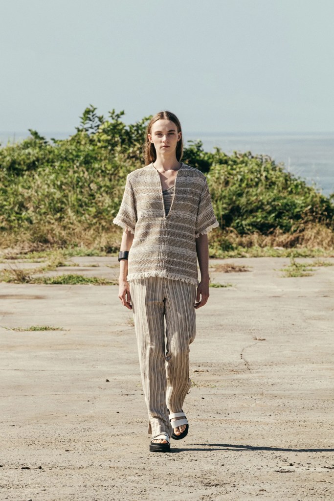 CINOH ‘s collection is the answer to the office worker’s dilemma of going back to the office after the pandemic, with light and airy clothing similar enough to the comfortable clothes we’re used to wearing while working or learning from home, but structured enough to be accepted at the office. Designer Takayuki Chino brings in fringe, tie-dye patterns, lace inserts, and shirts large enough to nearly be considered tunics to bridge the gap between the comfort of home clothes and sensible style office and business wear.
