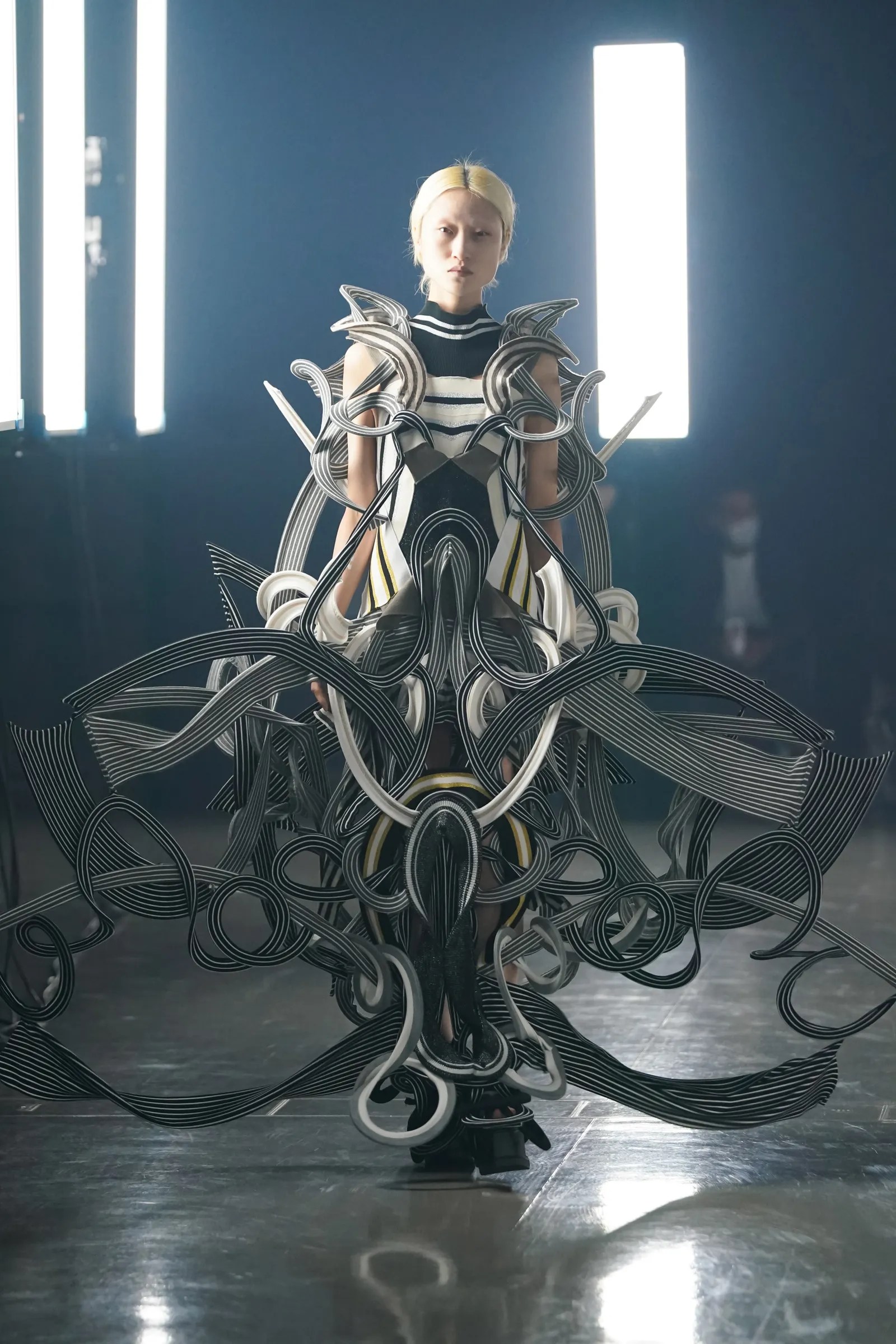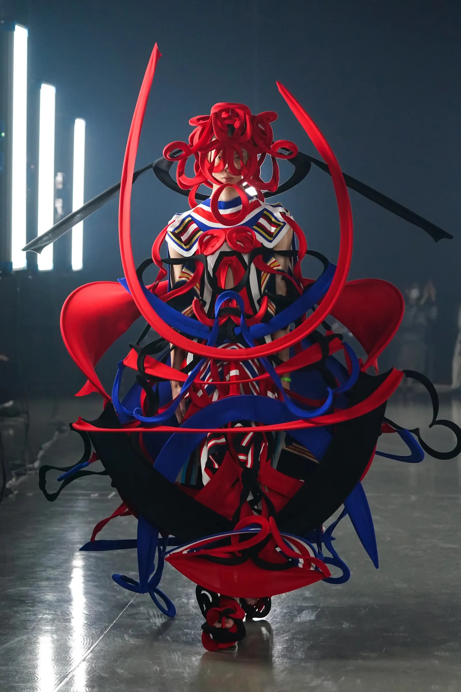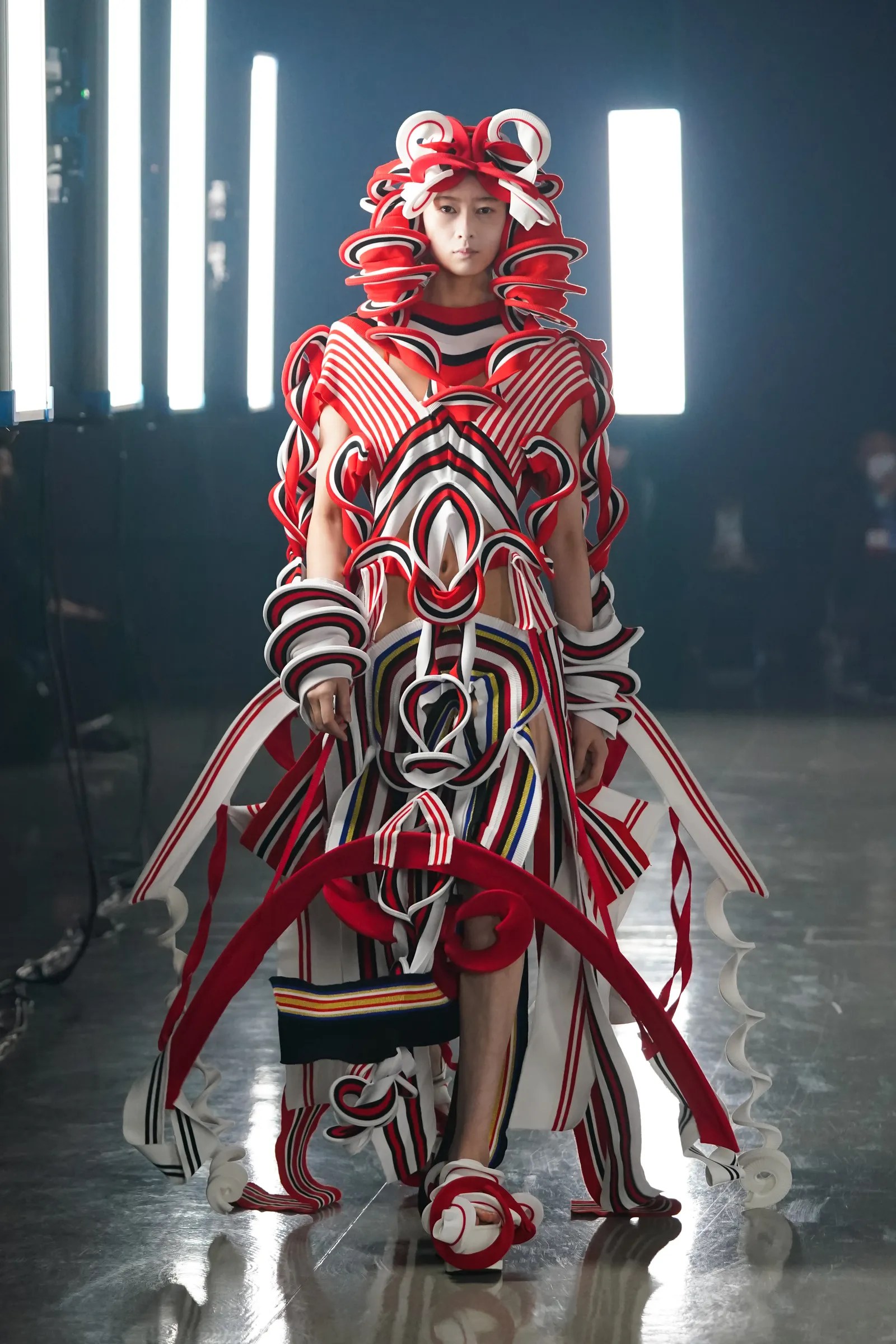 Starting off with the most eccentric and awe-inspiring of the group, emerging artist Ryunosuke Okazaki came to the runway with 23 looks, inspired by nature and history, the Jōmon period of Japan which dated from 4000-300 BCE. With geometric construction and vivid colors, the silhouettes that he creates are unique, with a futuristic, insect-like appearance, fragile, but strong with symmetry throughout each piece. Okazaki’s work is truly an art form, perhaps belonging in a modern art museum as well as on the runway.