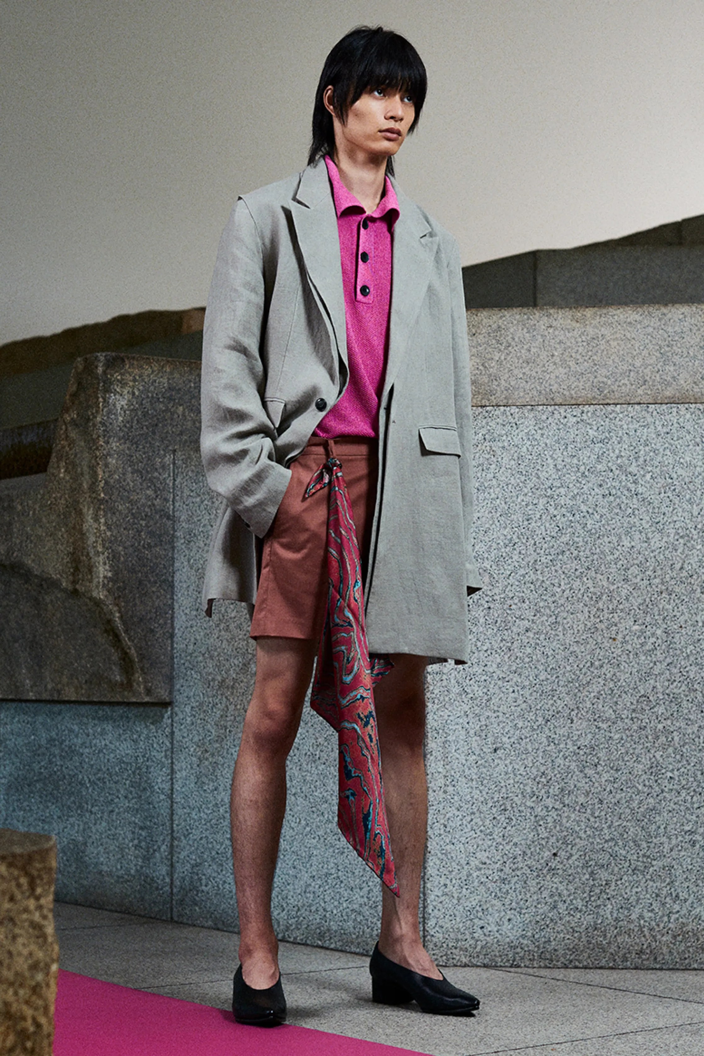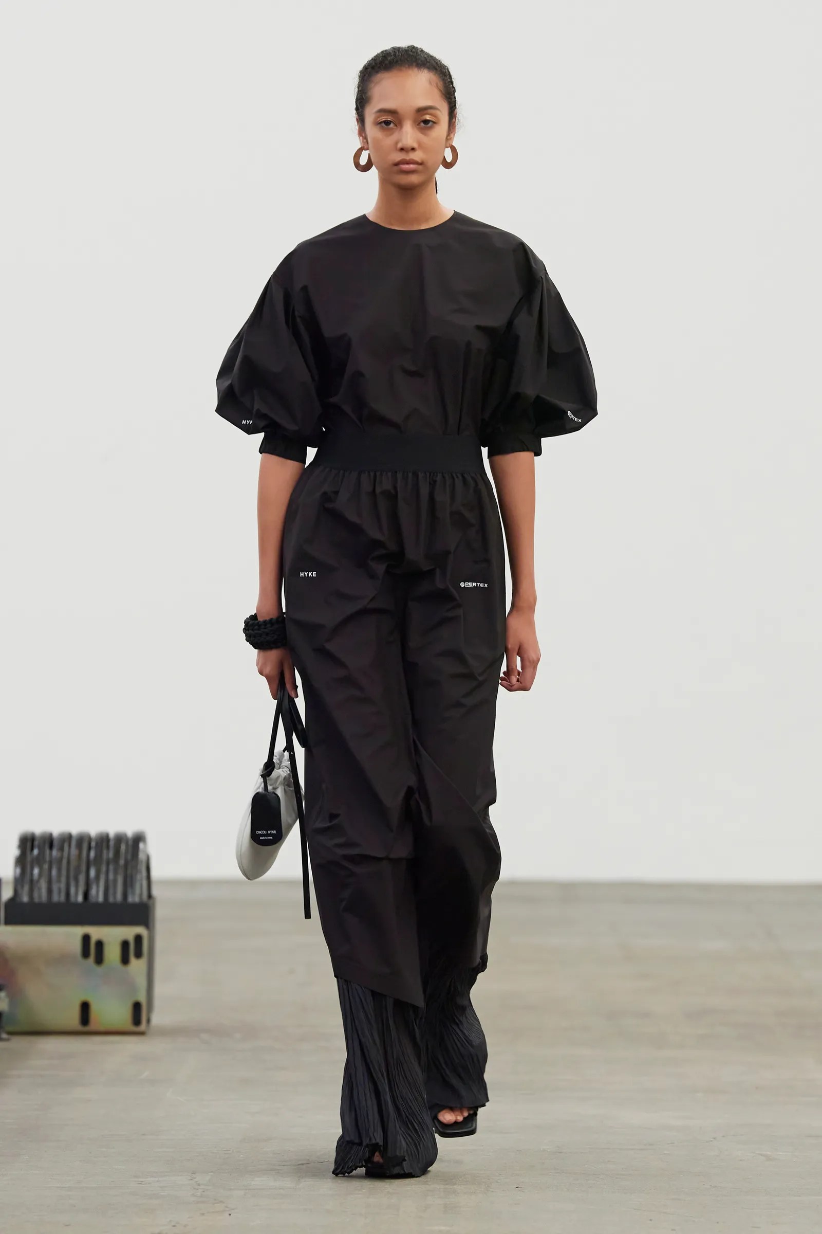 Hyke brings a sense of coolness to Tokyo Fashion Week, with muted beiges, navy blues, and blacks (with the exception of one bright teal colorway) bringing a sense of calm between the extremely colorful storms of HARE and Ryunosukeokazaki. With military inspired looks and the inclusion of new takes on vintage 90s outerwear, this collection is certainly one chock-full of daily wear garments. Designers Hideaki Yoshihara and Yukiko Ode are lovers of vintage styles, hence the military look; however, very sharp shoulders are contrasted with near Elizabethan puff sleeves, bringing contrast into this collection.