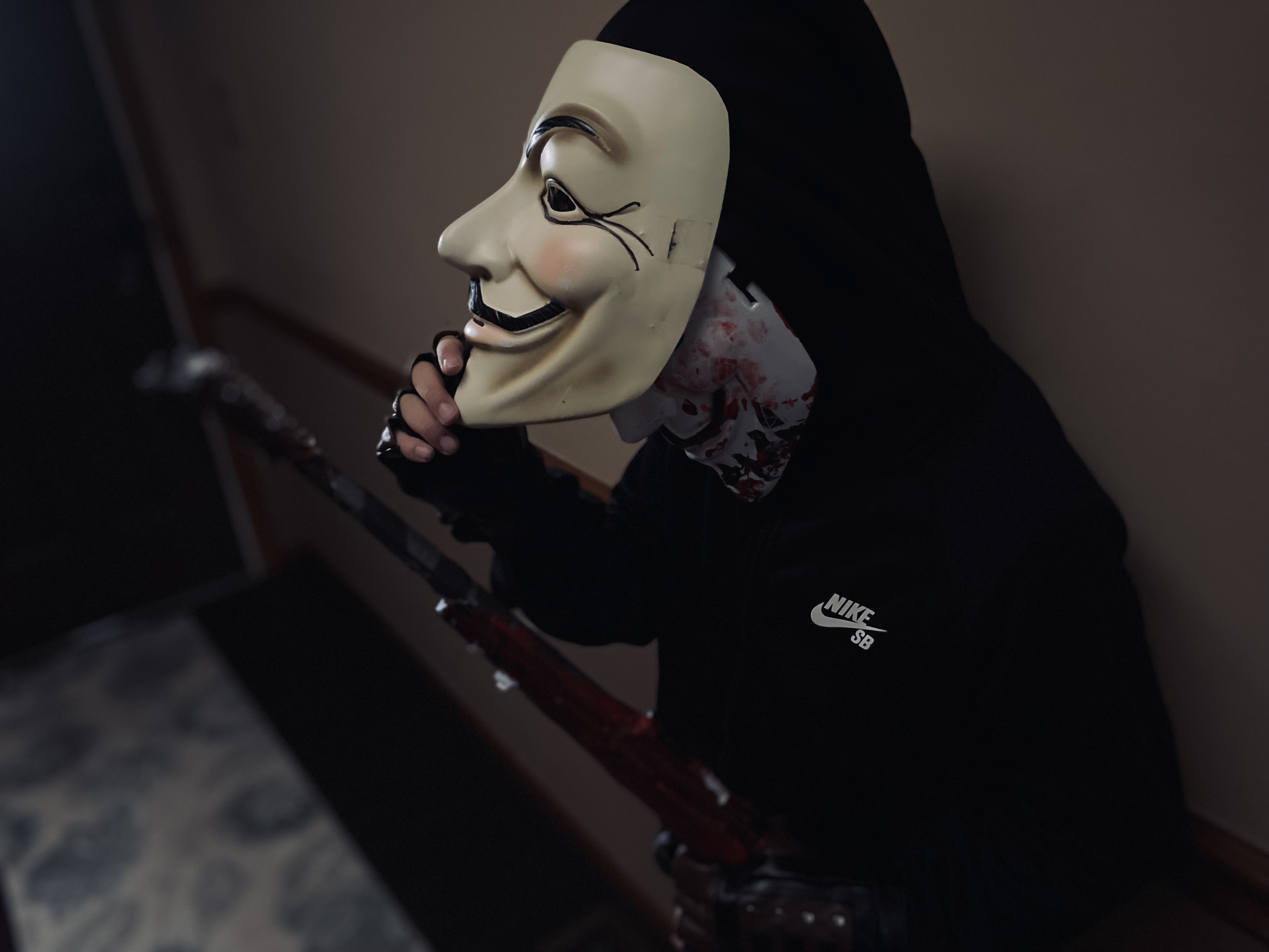 Next, we have a Purger from the classic horror trilogy, “The Purge,” a political thriller with our new founding fathers sanctioned by the U.S. government. All crime is legal for 12 continuous hours, including murder that takes place from 7pm on March 21 to 7am on March 22. During this time, crime is legal to cleanse America, to get rid of the hate inside of citizens. In this outfit, we have the Anonymous mask painted with red and black, black sweater, steampunk gloves for style, and a Nerf gun painted with red and black paint. Add an extra Anonymous mask to go over the painted mask.