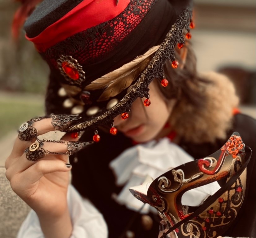 First we have Sir Billiam III, coming from the Dream SMP series. A Minecraft pig with ambitions of his own, he owns a mansion where the masquerade balls takes place. He wears half black and half gold, very Victorian. In this outfit, we have a decorated top hat, white frills for the Victorian look, a masquerade mask, a fur lined cape, steampunk fingers, black blazer, black pants and long black boots for this Halloween costume. This look accentuates the masquerade ball and Sir Billiam III himself.
