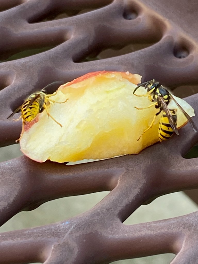 It is unlikely that the wasps will be leaving in the near future. As reported by the University of California Agriculture and Natural Resources (UCANR), “Once wasps discover food, they will continue to hunt around that location long after the source has been removed.” With an almost daily source of sweet and sugary foods and fruits like apples, a variety of apple sauces, pears, and peaches, it is unlikely that they will ever abandon such a consistent feeding location.