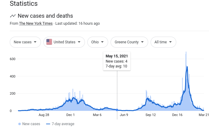 The New York Times graph reports how the COVID cases are going in Greene County, Ohio. When the Omicron variant emerged at the end of 2021, it spiked above six hundred new Covid cases year, but now it has fallen up to this point in March.