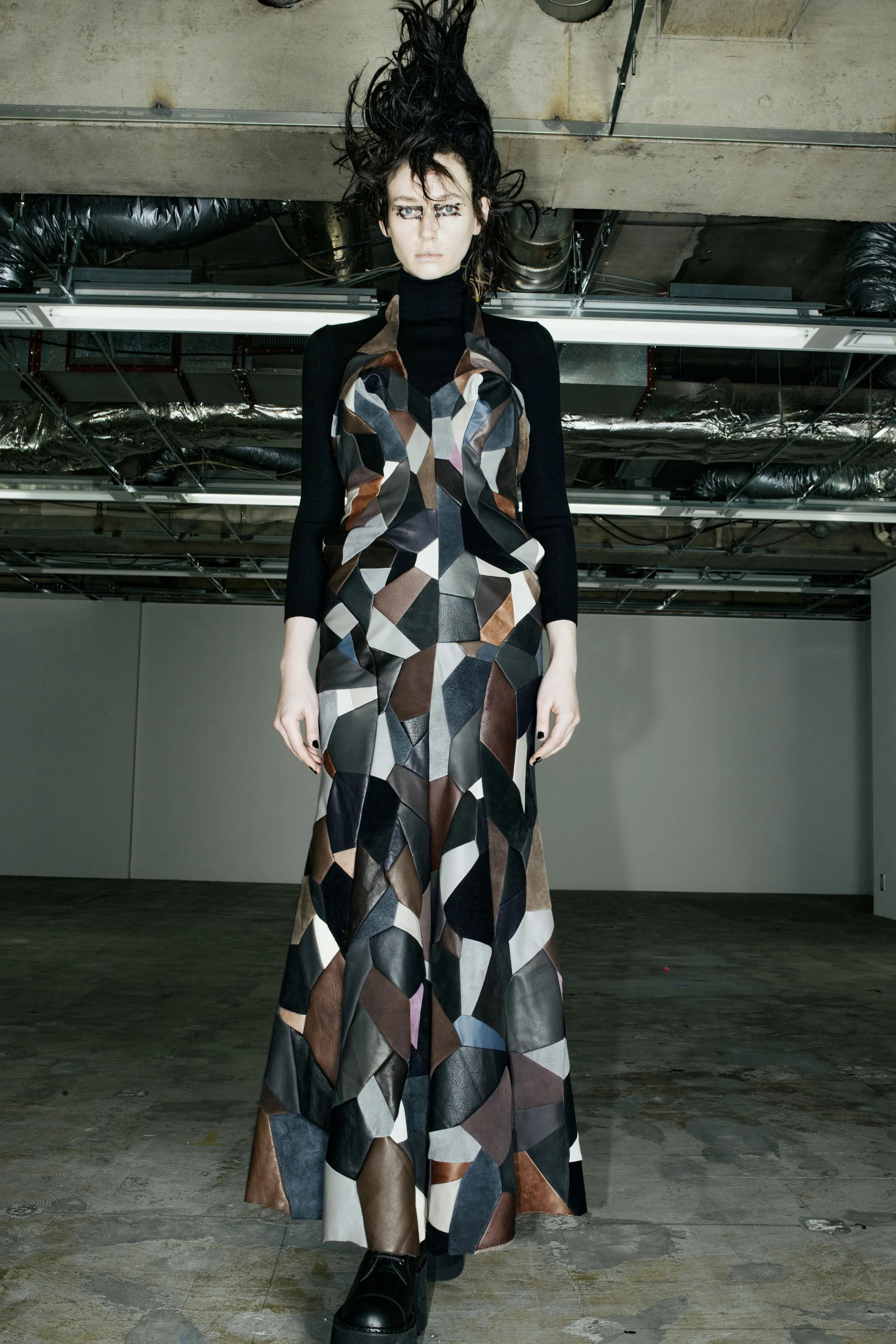 Watanabe named the collection “the spiraling of winter ghosts,” after a subtitle of a track on an 1980s album by David Sylvian (from the 80s New Romantic band Japan) and Holger Czukay. This description is definitely seen throughout the runway, whether it be through shining, flowing leather or the flowing silhouettes of some of the patchwork-esque dresses. The textures of all the clothes also add to the ghostly appearance of the collection as a whole. The way the light reflects off the leather makes the models appear otherworldly, and the almost Victorian-era shapes of the dresses harken to an older time and make it seem like the models walked out of the late 1800s and through a machine to transform the fabric into a modern garment.