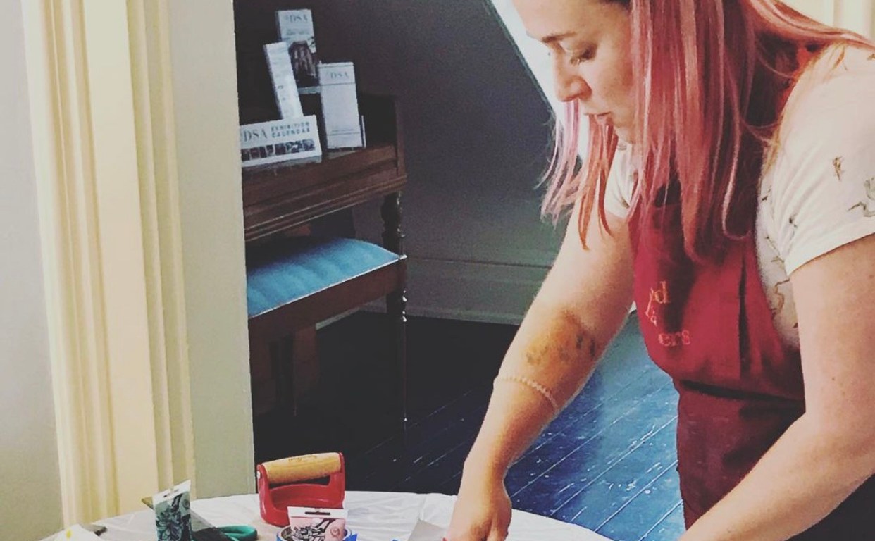 Parsons grew up with art and loves seeing students have the same inspiration she had when she was younger. She enjoys watching her students “click,” as she puts it, where they unlock a new skill and put exactly what they want on the page. Parsons focuses a lot of her time on printmaking. “My concentration in college was printmaking, so a lot of my work revolves around that process. I love creating linocut prints because I really like the interesting marks you can achieve with that process.” Linocut is a type of woodcut printing that uses a sheet of linoleum for a relief surface.