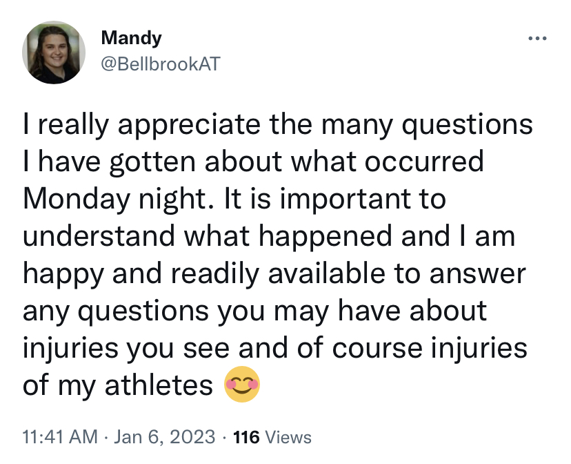 “Safety wise, obviously injuries happen all of the time and they are more orthopedic than cardiac, so I see more of that on a daily basis,” Woll said. “A lot of people have had questions about what happened, so I was mainly just addressing if anyone had any specific questions about any cardiac issue.”