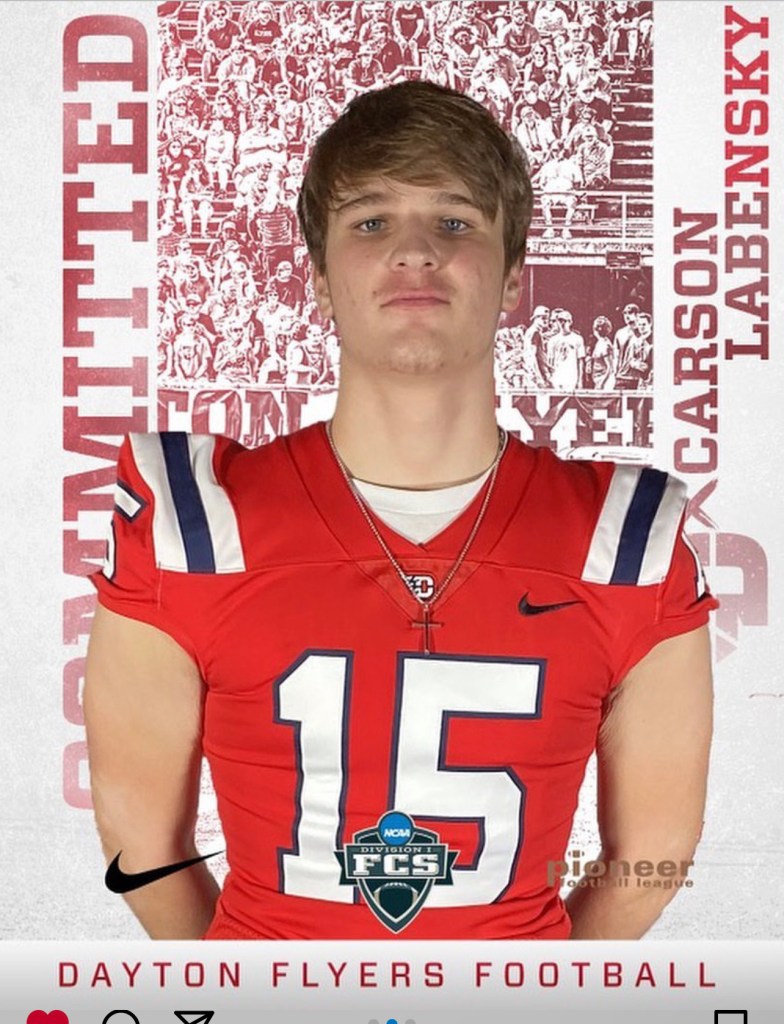 Carson Labensky had many offers to play college football including Thomas More University, Ohio Dominican, Wilmington University, and Bluffton University. But at the end of the day, he chose the University of Dayton. Labensky’s goal for his career in college is to win as many games as possible while helping his team.