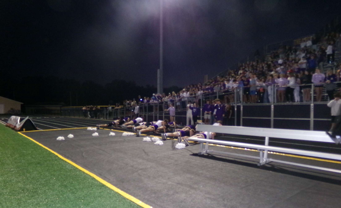 The Powder Puff cheer squad had practices a few times a week. The boys learned a halftime dance which included the song “Hotel Room Service” by Pitbull and stunts. After they did the human bowling technique, where they bowled Connor Spriggs into the human pins, they all fell down to the ground.