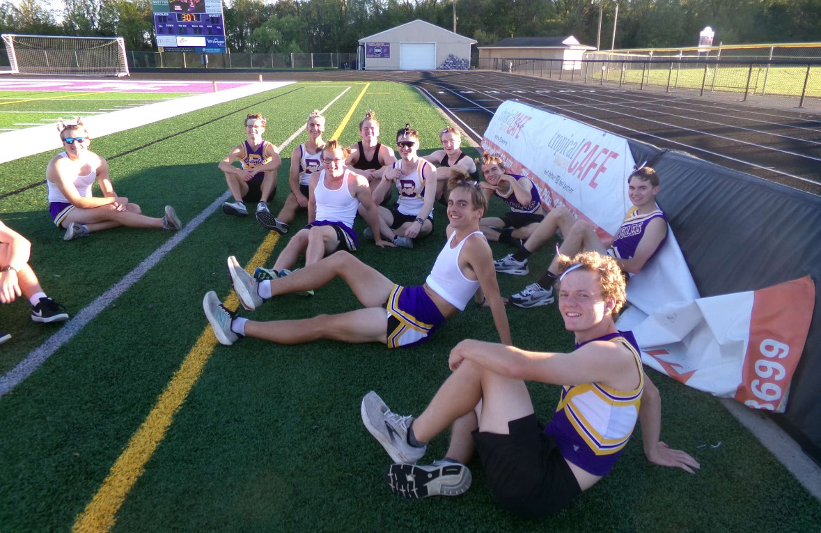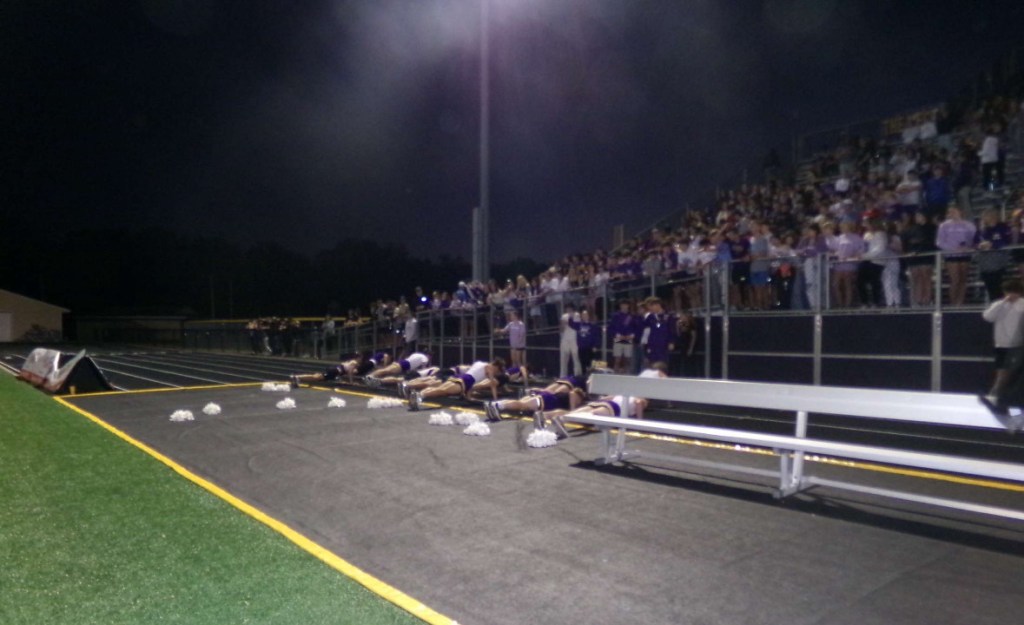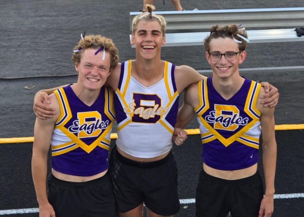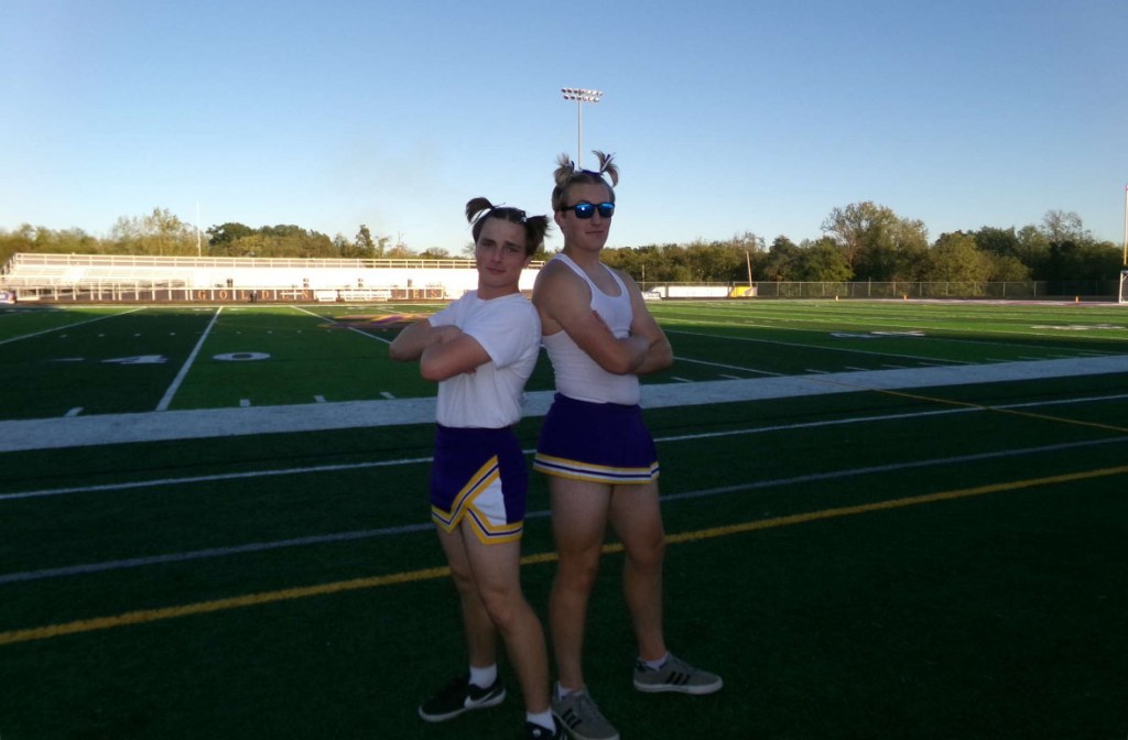 Every year for the Powder Puff game, people from the senior class can sign up to participate in cheerleading in front of the student section while the seniors play football. Typically, members of the boys’ cross country team volunteer and get to do their own halftime show and learn all the sideline cheers. They wear old cheer uniforms, including the tops, skirts, and bows.