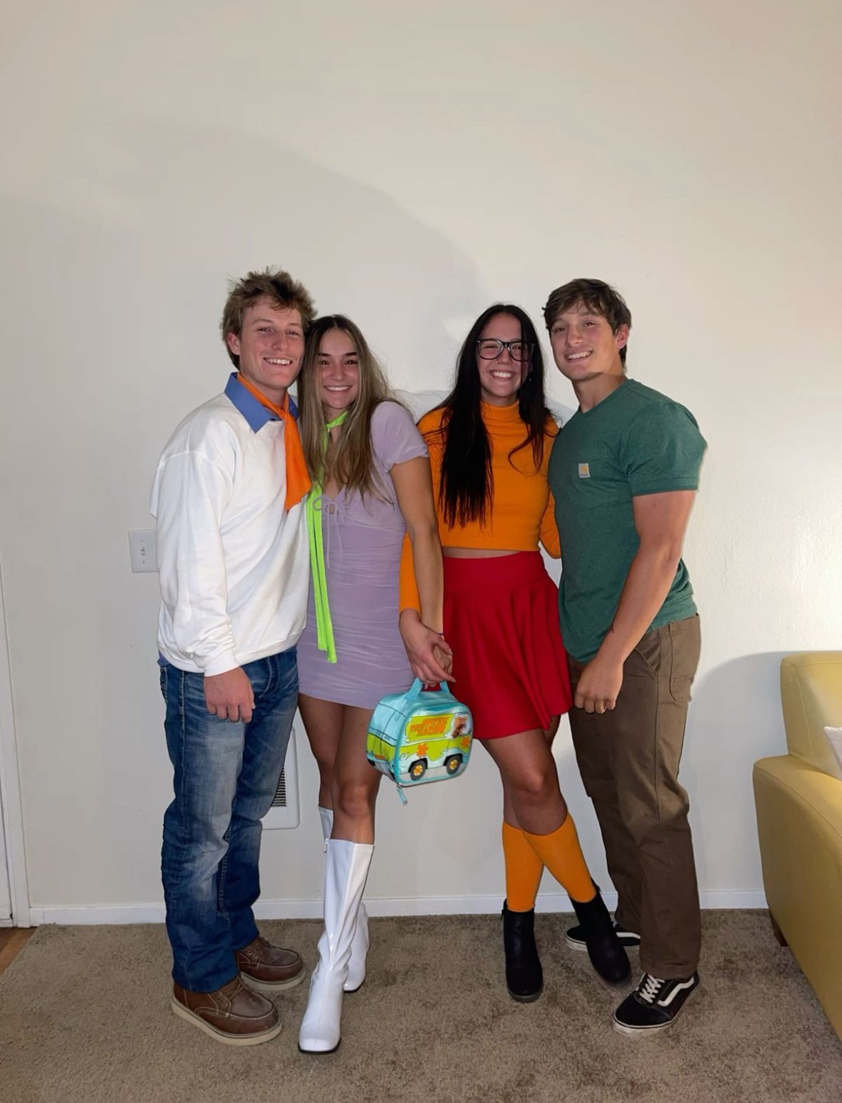 Mystery Incorporated, the classic group from Scooby Doo, can be an easy costume to put together. All parts are clothes people normally have or clothes that can be found while thrifting or at Target or Walmart. For Fred, all you would need is jeans, a white long-sleeve shirt over a blue collared shirt, and an orange piece of fabric to be his classic ascot. Daphne wears a purple dress or skirt with a green scarf and simple white boots. Velma would need a red skirt, orange top, orange socks and black shoes. Shaggy is simple with a green shirt and brown pants.