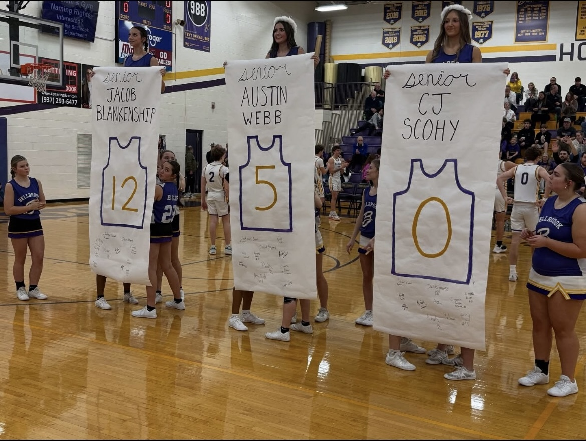 The men’s basketball seniors are Jacob Blankenship, CJ Schoy, and Austin Webb. The basketball cheer seniors are Phoebe Bretland, who also does gameday, and Isabella Bird. The competition and gameday seniors are Katie Griffin, Lily Westwood, and Makenzie Hammel.